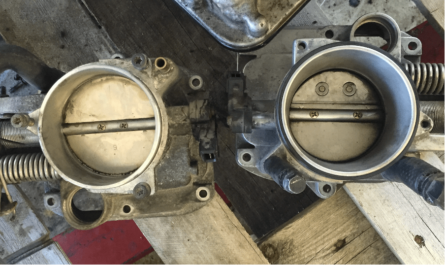 Comparison of stock M6x throttle bodies. Left: The preferred, cable driven 80mm throttle body from M62B44 non-Vanos engine. Right: M6x throttle plate with the wedge (Flow restriction at WOT) can be identified from the rivets on a throttle plate.