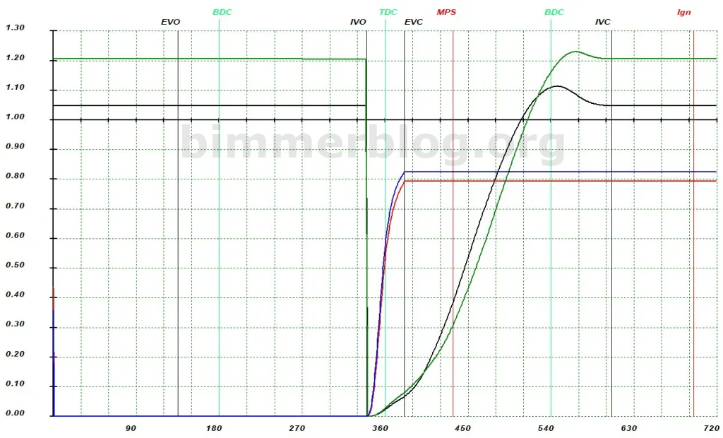 Hot street M60B44 at 4700rpm. Black line is intake pressure ratio at the intake valve. Green is pressure trace at the exhaust valve. Note the pressure differential during overlap. Red is cylinder pressure.