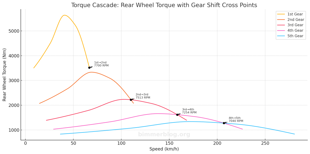 The chart above is illustrating how much actual torque rear wheel is transferring to ground. When you upshift, the amount of torque decreases in relation to transmission gear ratio. The best acceleration is achieved by maximzing the area under the torque cascade.