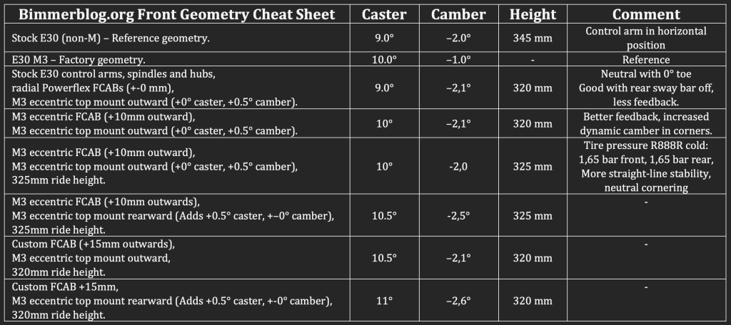 Here’s quick Cheat Sheet to E30 front geometry. The table below presents a comparison of various E30 front suspension setups, normalized to a baseline where the control arm is horizontally aligned. This allows for accurate comparison of caster, camber, and wheel position. The baseline setup uses E30 control arms, stock spindles, and hubs.