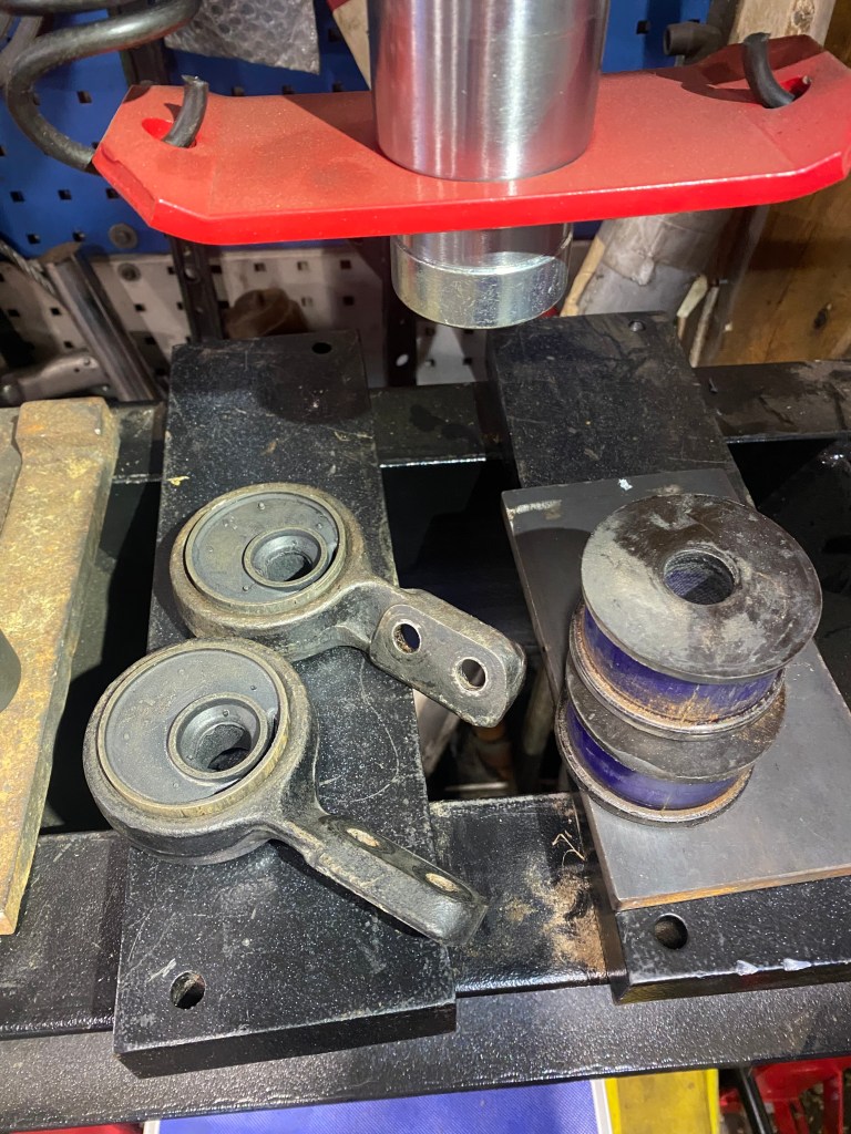 Hydraulic press is needed to swap bushingsToe angle must be set to zero after changing eccentric Front Control Arm Bushings (FCAB). Zeroing the toe can be done with a string line. The Precise adjustment is more to do with carefulness while tightening the locking nut than having expensive equipments. Custom fabricated tool was needed to insert M3 Evo eccentric FCABs.